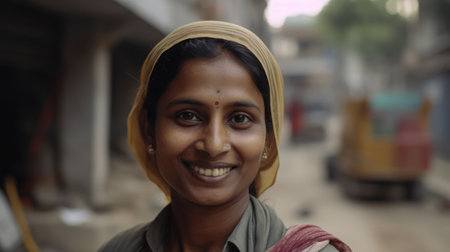 A smiling Indian female construction worker standing in construction site. Generative AI AIG19.