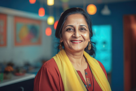 Mature smart indian businesswoman, smiling face, standing in blur background of creative colorful office interior design. Generative AI AIG20.