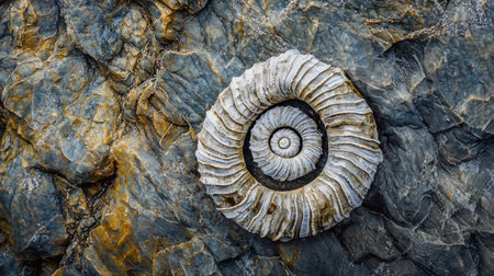 Discover a stunning close-up of a fossilized ammonite nestled in natural stone, showcasing intricate textures and patterns from ancient history.