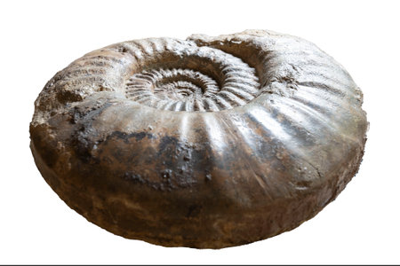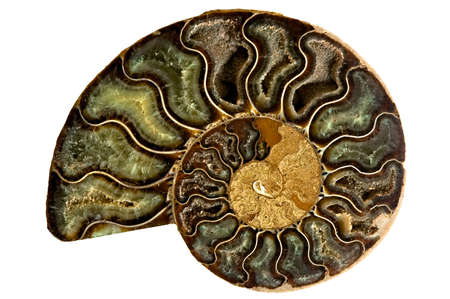 Image of an ancient fossilized nautilus shell isolated on a white background
