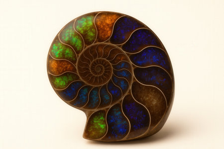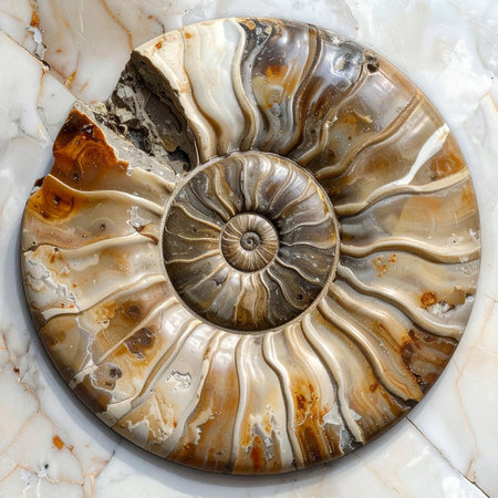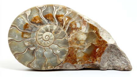 This close-up image features a beautifully preserved fossilized ammonite shell, showcasing intricate patterns and natural colors, perfect for educational and artistic purposes.