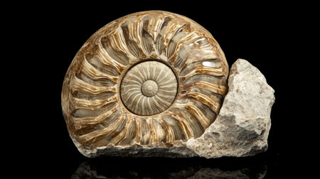 A beautifully preserved fossilized ammonite shell is displayed prominently revealing the intricate patterns and textures of its structure. The shell is a striking example of ancient marine life from the past characterized by its coiled shape and smooth surface