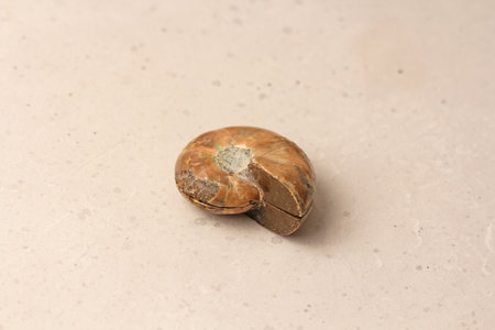 Ammonite fossil shell. Whole of an ancient ammonite lie on a light background. Whole of a sawn ammonite fossil shell.