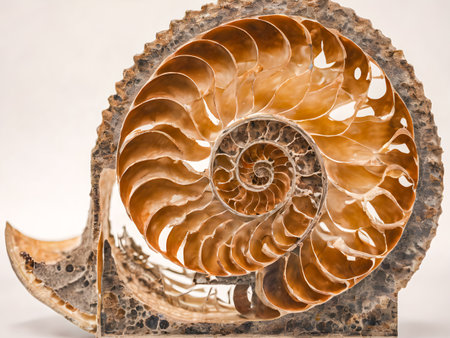 Golden spiral texture inside ammonite shell with fibonacci spiral
