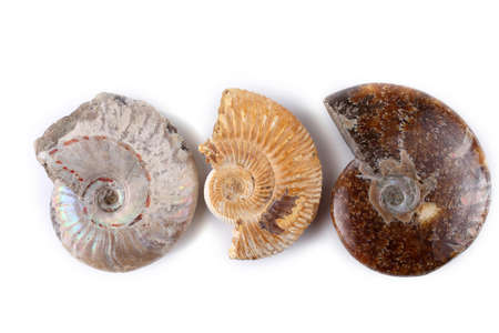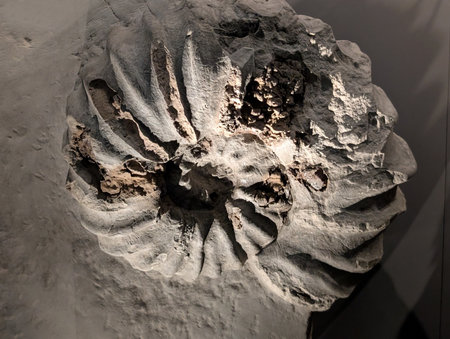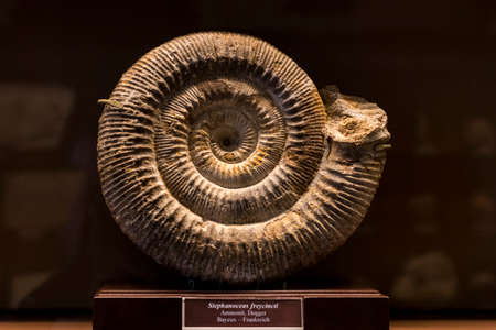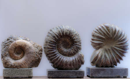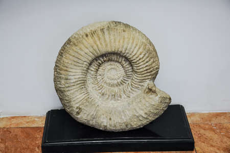 HOUSTON, USA - JANUARY 12, 2017: Fosilized seashell amonites exposition over a white base, in National Museum of Natural Science in Orlando Houston in USA