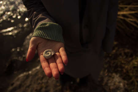 a girl on the seashore, in a long raincoat. collects pebbles and shells in his hand
