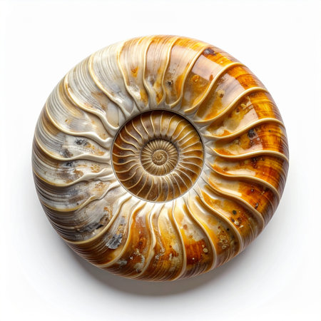 Explore the stunning detail of an intricate nautilus shell featuring Fibonacci spiral patterns. This close-up macro photograph showcases the natural beauty and complexity of marine life.