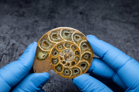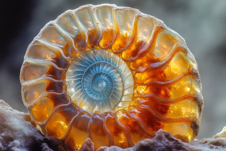 A perfectly preserved ammonite fossil reveals its inner chambers, a beautiful golden spiral that tells a story of ancient oceans and the mathematical precision of nature.