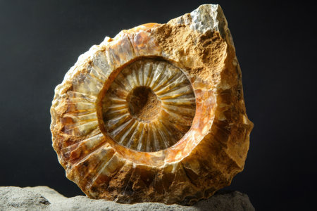 Ammonite fossil is present on rock. Details of spiral reveal millions of years of evolution. Amber reflects bursts of light. Doubs, France, Europe.