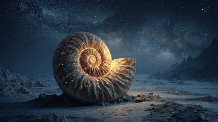 A glowing spiral shell rests on a barren landscape as stars twinkle brightly in the night sky.