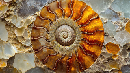 Discover a stunning close-up of a fossilized ammonite nestled in natural stone, showcasing intricate textures and patterns from ancient history.