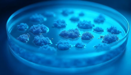 microbiology laboratory research and development concept - close up of petri dish with blue bacteria
