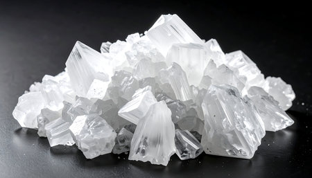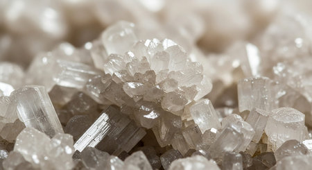 An extreme macro photograph captures the intricate detail of translucent salt or sugar crystals. The backlit crystals sparkle, revealing their geometric shapes and a delicate coating of moisture droplets on their surfaces. This abstract image provides a textured, crystalline background.
