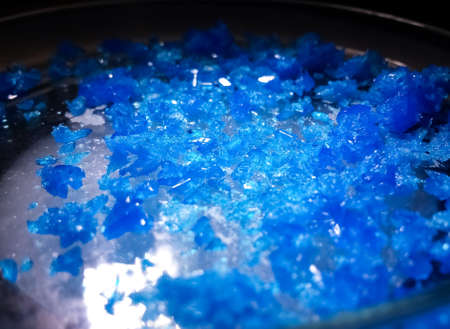 Close up inorganic chemical on white laboratory table. Copper(II) sulfate, alcohol. Chemical ingredient for Cosmetics and Toiletries product.