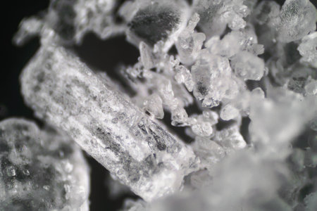 Microscope photo of salt in dark background. Salt or sugar close up background