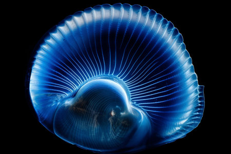 A radiant, spiral-shaped object dominates the frame, showcasing a luminescent blue hue against a deep black backdrop. The artwork presents a detailed, almost X-ray-like quality, highlighting the object's intricate internal structure. Suitable for artistic projects, design elements, or science-related themes, the image may serve various commercial applications.
