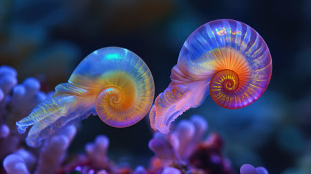 A stunning and vibrant underwater image featuring a unique sea creature. This ethereal being glides gracefully through crystal-clear waters, showcasing its intricate shell and the serene beauty of marine life.