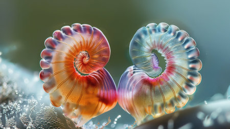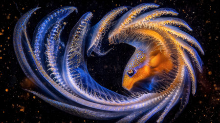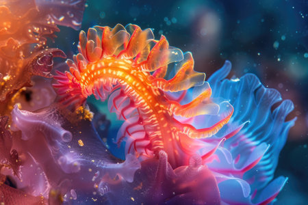 An enchanting sea snail showcases luminous patterns against a blurred blue background. This stunning underwater scene captures the beauty of marine life and delicate ecosystems.