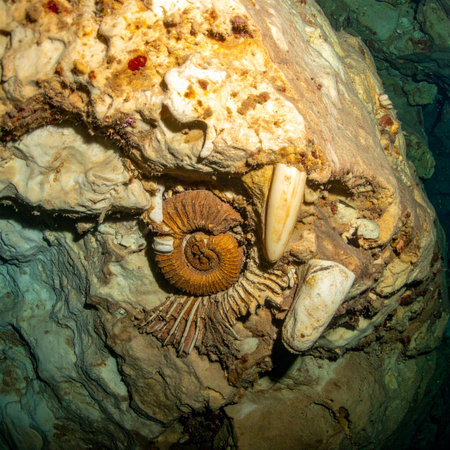 A perfectly preserved ammonite fossil, a relic from a prehistoric era, is revealed within the rugged rock of a submerged cave. This underwater discovery offers a glimpse into Earths deep past, a hidden treasure for paleontologists and adventurers alike.