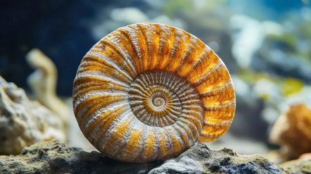 A beam of light illuminates an ancient nautilus shell resting on the dark, rocky seabed. This living fossil, with its perfect spiral pattern, evokes a sense of deep-sea mystery, timeless evolution, and the hidden wonders of the underwater world.
