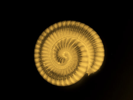 A perfectly preserved ammonite fossil reveals its inner chambers, a beautiful golden spiral that tells a story of ancient oceans and the mathematical precision of nature.