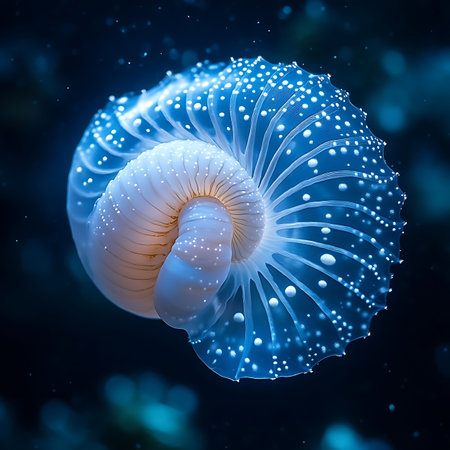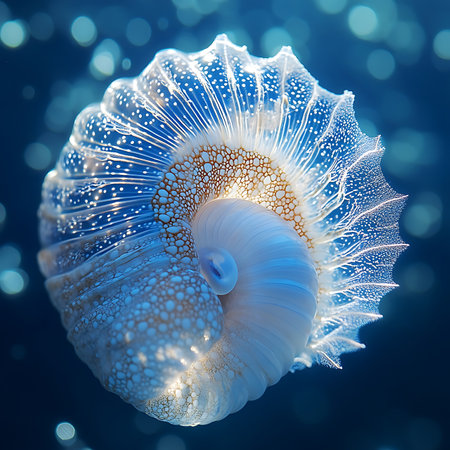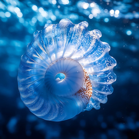 A mesmerizing sea creature floats gracefully in deep blue waters, showcasing its ethereal beauty and unique spiral shape, illuminated by bioluminescence.