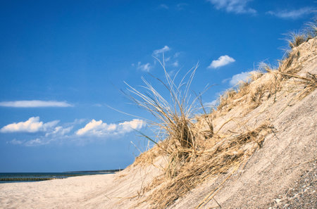 Dune on the beach of the Baltic Sea with dune grass. White sandy beach on the coast. blue sky Landscape shot from nature