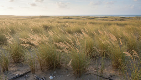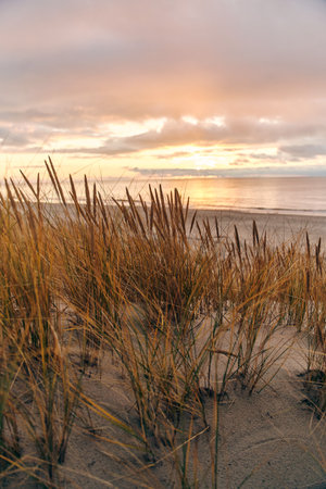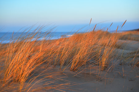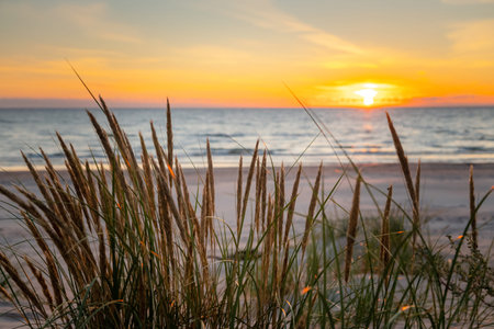 Beautiful beach grass at the Baltic sea during sunset hours. Seaside scenery in Northern Europe.