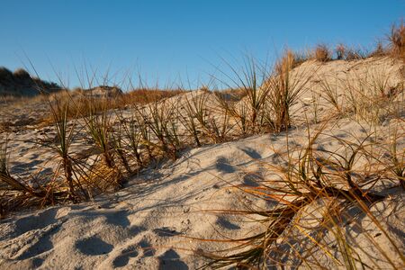 Landscape of sand dune and grass by the sea, blue sky, Leba, Baltic Sea, Poland, nature backgrounds.