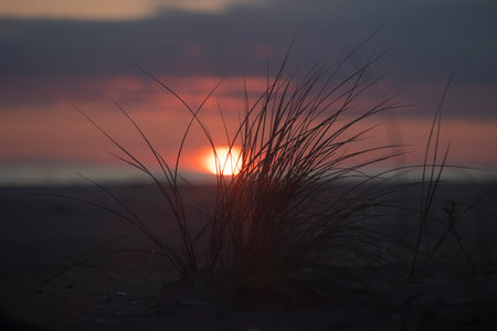 A beautiful sunset scenery with grass growing on the beach of Baltic Sea. Summer evening in Latvia, Europe.