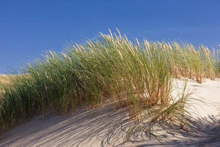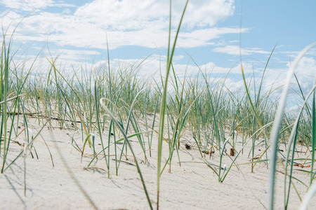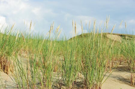 Grass and white sand dunes on the beach on a hot summer afternoon.