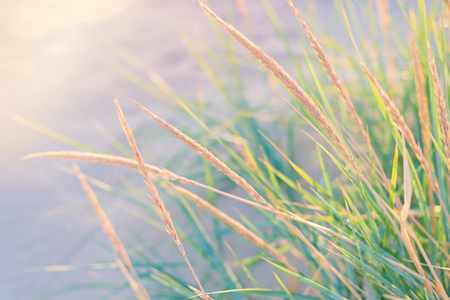 Golden spikelets in sunset light on the sandy beach. Landscape of sunrise.