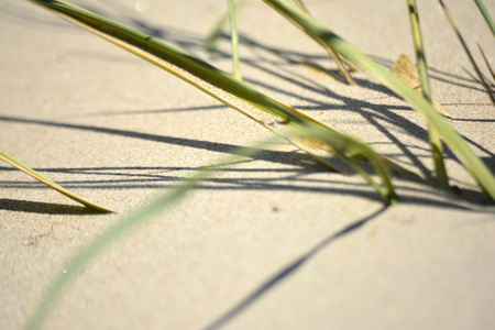 Close-up of fine yellow sand and green grass in the dunes of a Dutch beach on a sunny and windy day