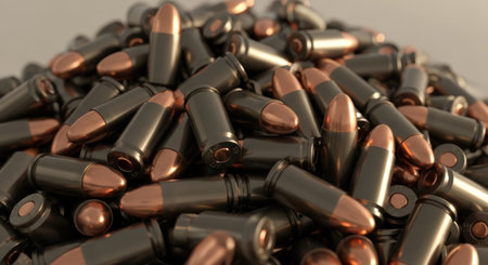 A large pile of pistol ammunition rounds with dark casings and copper tips. The heap of bullets suggests concepts of conflict, security, and military.