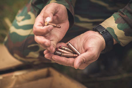 Cartridges lie in a box, a womans hand holds a live cartridge on the background of bullets, military weapons, war in Ukraine