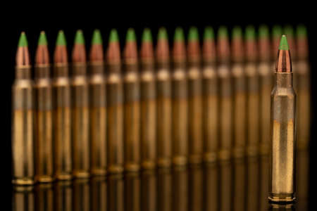 A group of 5.56 calibar, green tip bullets ordered into the line on black background