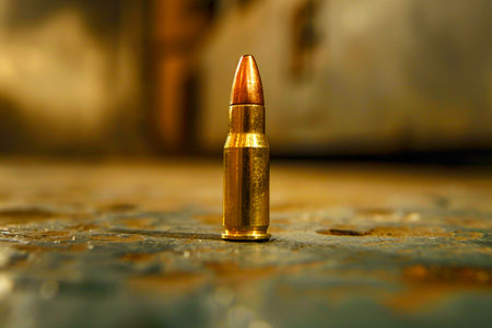 bullet on a wooden surface, emphasizing their metallic texture and weaponry theme. Generative AI