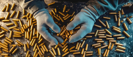 From above, a worker in gray gloves carefully sorts through a scatter of rifle cartridges, placing them into an awaiting glove on a dark surface.