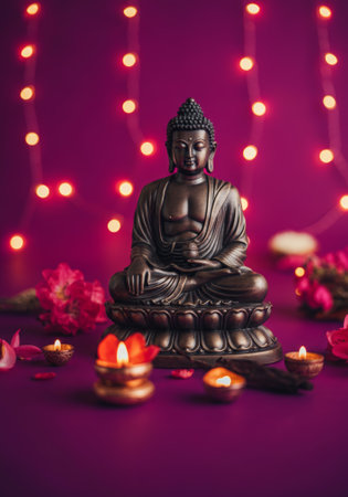 A stunning image of a Buddha statue adorned with festive decorations and illuminated at night, capturing the essence of spirituality and celebration during Vesak Day, created using generative AI techniques.