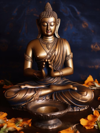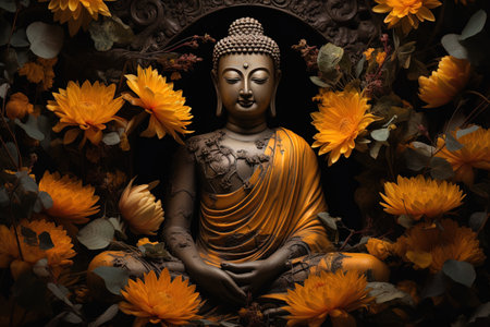 A buddha statue surrounded by flowers and petals, Generative AI