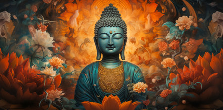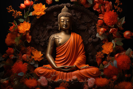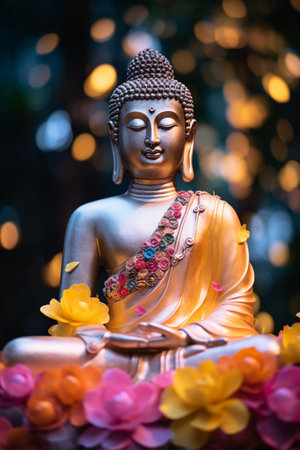 Colorful gautam buddha statue with flowers image AI Generated Image