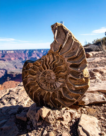 A beautifully preserved ammonite fossil, a relic of an ancient sea, rests on the rocky rim of the Grand Canyon. This juxtaposition of prehistoric marine life against the immense geological wonder creates a powerful narrative of Earths deep history, time, and transformation.