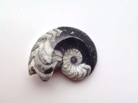 Ammonite is a fossil of a squid, photographed in close-up in the studio