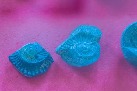 HOUSTON, USA - JANUARY 12, 2017: Fosilized seashell amonites exposition over a white base, in National Museum of Natural Science in Orlando Houston in USA