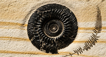 A beautifully preserved black ammonite fossil is embedded in layered sandstone, alongside the delicate impression of a fern leaf. This image showcases prehistoric marine life and flora from millions of years ago, representing paleontology, geology, and evolution.