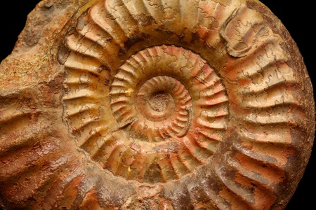 Fossil of ammonite. Macro shot of an ammonite fossil, possessing the typically ribbed spiral-form shell