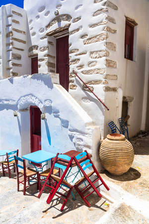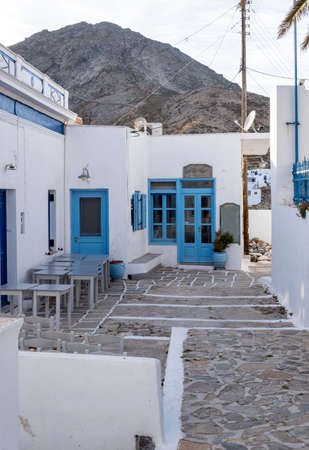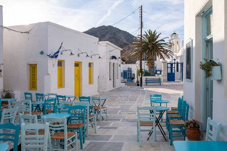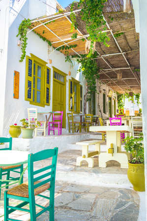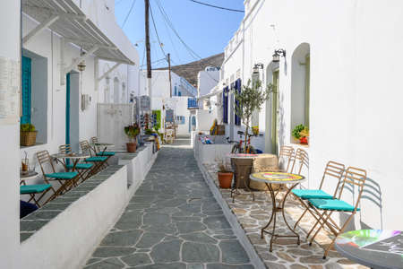 Serifos island, Chora, Cyclades Greece. Traditional outdoors cafe tavern, empty tables and chairs on cobblestone street Summer destination vacation sunny day.