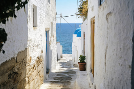 Narrow, stone pathways lead towards the azure sea in a charming coastal village under a clear blue sky.