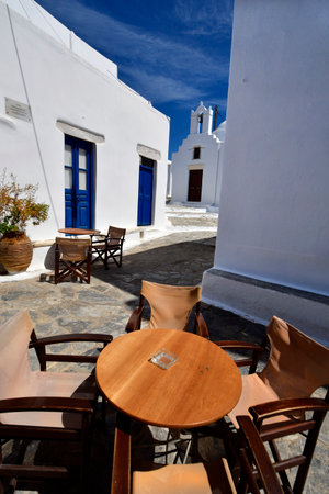 Greece - seating area of ​​​​a cafe in the narrow cobbled street with a view of the church entrance with bell tower in Chora on Amorgos island - a wonderful Cycladic island in the Aegean Sea