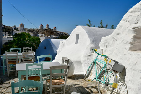 Amorgos, Greece - September 11, 2025: Colorful seating and bicycle on a terrace cobbled with stones with view to the old windmills on hill